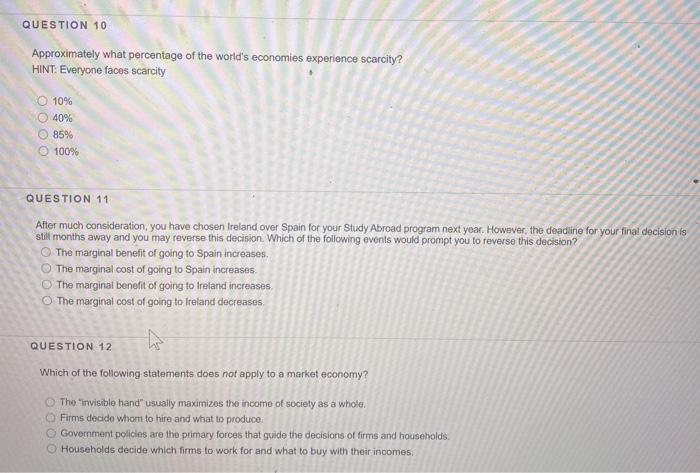 Suppose a student athlete has the opportunity to earn 20000 next year playing for a minor league baseball team 900000 next year playing for a European professional football team or 0 returning to college for another year The opportunity cost of the student athlete returning to college next year is _____. Everyone faces scarcity 10 40 85 100 QUESTION 11 After much consideration you have chosen Ireland over Spain for your Study Abroad program next year. Approximately what percentage of the worlds economies experience scarcity.